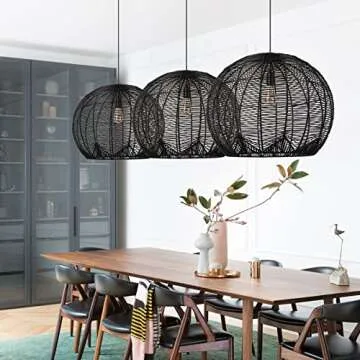 Arturesthome Rattan Pendant Light for Kitchen Island, Boho Wicker Chandelier Lighting, Handmade Woven Hanging Ceiling Light Lampshade for Living Room Bedroom Black