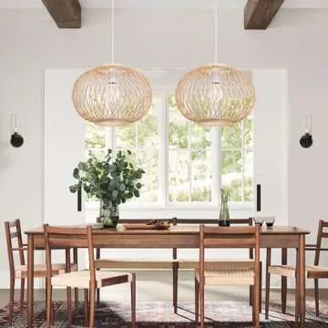 Show more Illuminate your space with a touch of elegance and artistry by introducing this stunning natural bamboo weave chandelier into your home. This exquisite piece is designed specifically for those who appreciate the harmonious blend of coastal boho charm and modern simplicity. Not only does it serve as a practical light fixture, but it also acts as a breathtaking centerpiece, adding an element of sophistication and warmth to any room.