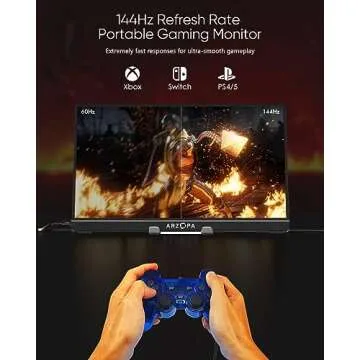 Show moreExperience gaming like never before with the ARZOPA 16.1'' 144Hz Portable Gaming Monitor. Featuring an ultra-high refresh rate of 144Hz and a crisp 1080P FHD resolution, this monitor is designed for gamers who crave high-performance visuals. The advanced 100% sRGB IPS anti-glare display ensures vibrant colors and remarkable picture quality, providing a significant upgrade for gaming, streaming, and work. Weighing just 1.7 lbs and measuring only 0.3 inches in thickness, it's incredibly portable, allowing you to unleash your gaming or work potential anywhere you go.