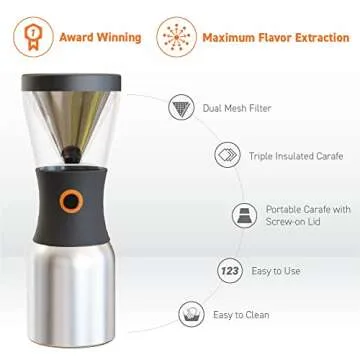 What sets this brewer apart is its portable design; accompanied by a spill-proof, stainless-steel mug made from high-quality 18/8 material, you can savor your cold brew wherever your day takes you - be it at home, in the office, at the park, or while traveling. This easy-to-carry mug is as practical as it is stylish.