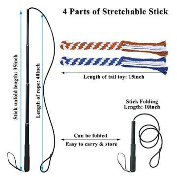 Show moreIntroducing the ASOCEA Dog Extendable Teaser Wand Pet Flirt Stick Pole with an exciting 5 Pack of Dog Rope Toys! This outdoor interactive toy is specifically designed to strengthen the bond between you and your furry friend, fostering mutual communication while engaging them in active play. It's not just a toy; it's an essential tool for keeping your dog physically stimulated and mentally engaged. The flirt pole features a robust extendable wand that can stretch from 10 inches to an impressive 35 inches, allowing you to play with dogs of all sizes effectively. This set also includes five vibrantly colored, handcrafted dog chew toys in Purple, Yellow, Green, Blue, and Orange, ensuring hours of endless fun!