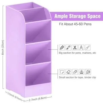 With a total of 15 compartments skillfully arranged among three holders, you'll never run out of space for your essentials. The ingenious design allows you to store up to 15-21 pens in the slanted middle slots, while the versatile top and bottom sections are perfect for keeping post-its, erasers, sharpies, and other small items organized. Measuring just 2.7 x 3.5 x 8 inches, this pen holder is compact enough to fit on any desk but spacious enough to keep your tools organized and easily accessible.