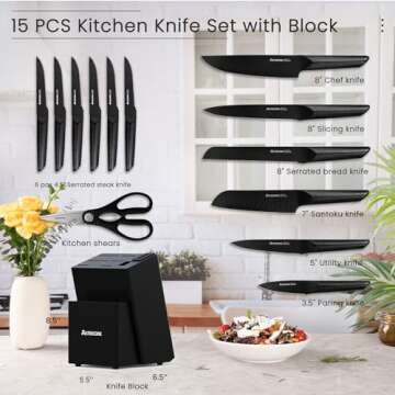 Astercook Knife Set, 15 Pieces Kitchen Knife Sets with Block and Built-in Knife Sharpener, German Stainless Steel Handle One-Piece Design Knives Block Set Dishwasher Safe, Black