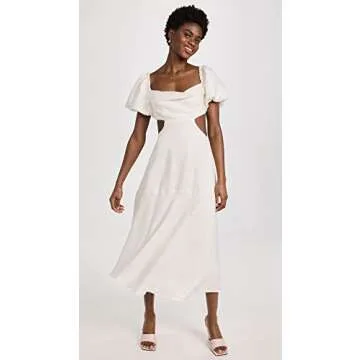 Show moreStep into elegance and charm with this stunning dress designed for the chic and fashionable woman. The flattering ruched bodice coupled with a wraparound cutout creates an alluring silhouette that enhances the figure, making it perfect for any special occasion. Crafted from 100% viscose, the lightweight non-stretch slubbed weave ensures you feel comfortable while looking fabulous. The short puff sleeves with elastic cuffs add a touch of romance and whimsy, making this piece ideal for both casual gatherings and more formal events.
