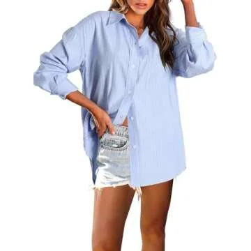 The delightful striped pattern brings a modern twist to a timeless look; it's not just stylish but also practical, as the stripes are designed in a way that cleverly hides stains, allowing you to maintain a polished appearance all day. Its long sleeves provide coverage and can be styled easily by rolling them up for a more casual vibe—ideal for comfortable summer days or transitional spring weather.