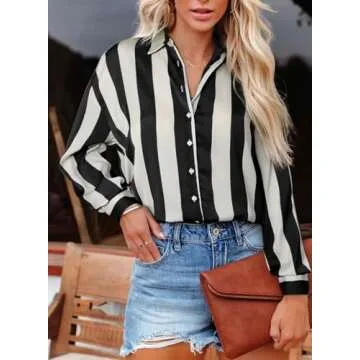 Astylish Women Fashion Button Down Soft Silky Shirt 2024 V-Neck Nice Color Block Long Sleeve Basic Work Formal Casual Blouse Striped Black Small