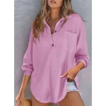 Astylish Women Oversized Waffle Shirts V Neck Lightweight Long Sleeve Loose Blouses Button Pullover Phalaenopsis Large