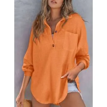 Astylish Women Oversized Waffle Shirts V Neck Lightweight Long Sleeve Loose Blouses Button Pullover Grapefruit Orange Large