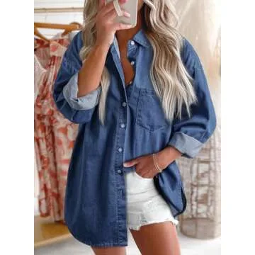 Astylish Women's Button Down Denim Shirt Casual V Neck Long Sleeve Classic Blouse Relaxed Fit Chambray Shirt Navy Blue Medium