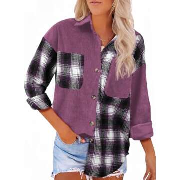 Astylish Womens Color Block Corduroy Shacket Long Sleeve Button Up Shirt Blouse Top Orchid Petal XX-Large