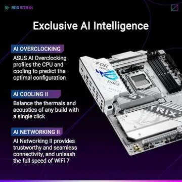 Equipped with intelligent control features like ASUS-exclusive AI Overclocking, AI Cooling II, and AI Networking, this motherboard streamlines setup for neck-breaking performance. You'll appreciate the ROG Strix Overclocking technologies, featuring Dynamic OC Switcher and Core Flex that allows you to customize your system's performance according to your needs.