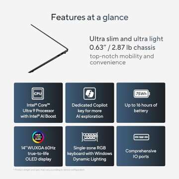 ASUS Vivobook S 14 OLED Slim Laptop, Intel Core Ultra 9 185H, 16GB, 1TB SSD, Fast Charging, RGB Keyboard, Thunderbolt 4, Neutral Black, S5406MA-AS96, Intel Evo Edition