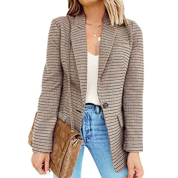 Show more Introducing the Asvivid Open Front One Button Plaid Blazer, a versatile staple for your wardrobe that combines style, comfort, and functionality. This beautifully designed blazer features a notch lapel collar and an open front structure, which makes it a perfect choice for both casual outings and professional settings. Made with lightweight and breathable fabric, it offers a comfortable fit suitable for all-day wear, whether you're at the office, on a date, or simply out shopping. The chic plaid pattern adds a touch of sophistication, transforming any basic outfit into a fashionable statement.