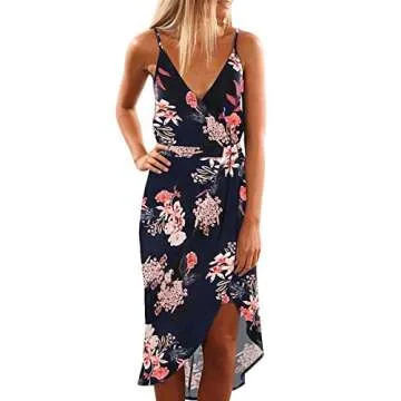 Show more Step into summer with confidence in the stunning Asvivid Women's Floral Printed Spaghetti Strap Dress. This captivating sundress features a delightful floral pattern that captures the essence of a sun-kissed vacation. Crafted from a lightweight chiffon fabric, the dress is designed to float gracefully with each step, providing ultimate comfort and style whether you're on the beach or at a garden party. The elegant wrap v-neck and sleeveless design let you celebrate the warmth of the season, making it ideal for any casual or festive occasion. Enjoy the flattering split details and loose midi silhouette, which together create a dress that enhances your femininity while ensuring ease of movement.