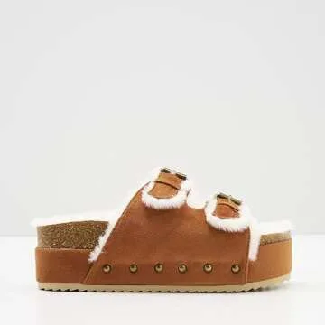 Show more Introducing the ultimate in comfort and style: these fabulous flatform sandals are designed to elevate both your feet and your outfit. Made with a luxurious suede leather upper, these sandals are not just about aesthetics; they are crafted for your solace. The soft faux fur lining caresses your feet, making every step feel like walking on clouds. Look forward to wearing them in chic colors such as black, beige, chocolate, and fuchsia, perfect for any wardrobe.