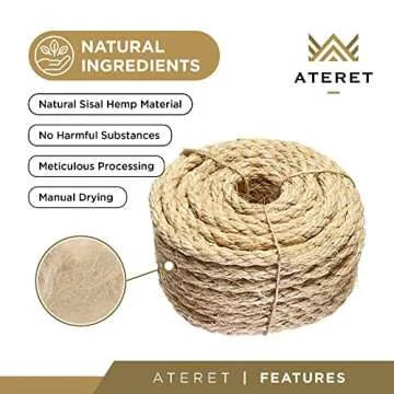 Show more Introducing the ATERET 3/8 Inch by 100-Feet Sisal Rope, the perfect solution for your crafting and DIY needs! Made entirely from natural fibers, this rope is not only strong and durable but also eco-friendly. Each strand of sisal is 100% biodegradable, making it a guilt-free choice for those who care about the planet. With its natural construction, this rope is devoid of chemicals and artificial additives, ensuring it’s safe for both your family and the environment.