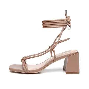 Athlefit Women's Chunky Strappy Sandals Lace Up Square Open Toe Ankle Wrap Nude Heels Size 10