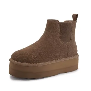 Show more Introducing our exquisite platform Chelsea boots, crafted with a genuine suede upper and a soft faux wool lining, offering an unparalleled combination of style and comfort. These boots are designed to keep your feet cozy and warm throughout the chilly winter months. With a trendy platform height of 2 inches, they effortlessly balance fashion with functionality, allowing you to stay stylish while enjoying all-day comfort.