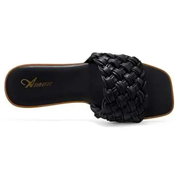 Athlefit Women's Square Open Toe Sandals Summer Casual Braided Strap Flat Slip On Slides Slippers Black Size 7.5