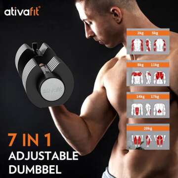 Show more The Ativafit 12 in 1 Adjustable Weights Set is a revolutionary addition to your home workout arsenal. This innovative set allows you to easily switch between weights ranging from 11LB to 66LB, accommodating a variety of exercises from strength training to high-intensity interval training (HIIT). With 12 adjustable levels, you can cater your workout intensity to target different muscle groups effectively, making every session a customized experience. The weights are comfortable to grip, ensuring safety and stability during your routines.