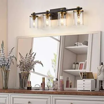 Show more Illuminate your space with the stunning Atocif Bathroom Vanity Light - a perfect fusion of modern sophistication and vintage charm. Crafted with attention to detail, this 4-light fixture features a sleek black and gold finish that enhances any decor, effortlessly transitioning from contemporary to classic designs. Its elegant clear glass shade not only diffuses light beautifully but also adds a touch of refinement, making it an ideal centerpiece for your bathroom, living room, hallway, or bedroom.