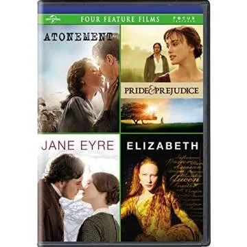 Show moreDiscover the enchanting world of classic cinema with our exclusive DVD collection featuring four exquisite films: Atonement, Pride & Prejudice, Jane Eyre, and Elizabeth. Each movie in this thoughtfully curated set offers a unique narrative that will transport you back to different eras, immersing you in stories of love, betrayal, resilience, and historical passion. Perfect for fans of sophisticated storytelling, this collection is a gem for those who cherish the beauty of period dramas and the depths of human emotion.