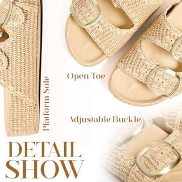 Show moreStep into summer with the Atsroel Platform Sandals, your go-to footwear for every sunny day. Crafted from eco-friendly raffia weave, these sandals fuse comfort and style seamlessly. The chic flatform design elevates your outfit while maintaining a lightweight feel that's perfect for all-day wear. With a cozy, thick sole measuring 1.25 inches, you won’t have to compromise on style for comfort. Designed for the modern woman, these sandals feature an easy slip-on style and a breathable woven material that keeps your feet cool during warm weather adventures.