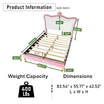 ATY Full Size Princess Bed with Crown Headboard and Lighting Design, Upholstered Platform Bedframe w/Slat Supports, for Girls Bedroom,No Box Spring Needed, Pink