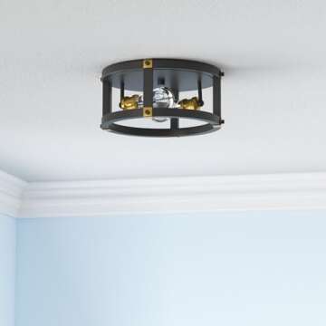 Show moreIlluminate your living spaces with the exquisite Audickic Farmhouse Ceiling Light Fixture, where vintage charm meets modern functionality. This stunning 2-Light Black Flush Mount light fixture showcases a robust black metal frame adorned with elegant golden accents, adding a touch of rustic sophistication to any room. Crafted with durability in mind, it resists fading, rusting, and corrosion, ensuring it remains a stylish staple in your home for years to come. With its size of 12.6" x 12.6" x 5.7", this fixture is both compact and space-conscious, making it an excellent choice for rooms with lower ceilings.