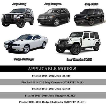 These covers are compatible with Jeep Wrangler JK (2011-2018), Liberty (2008-2012), Patriot (2010-2017), Compass (2011-2016), and Dodge Challenger (2008-2014). Please check compatibility before ordering.