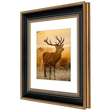 Show more Transform your cherished memories into stunning displays with the AUEAR 11x14 Picture Frame. Expertly designed to showcase your favorite photos, art prints, and postcards, this versatile frame offers two framing options: use the included bevel-cut white mat for an 8x10 display or simply remove it to exhibit an 11x14 print. Crafted with real glass at the front, it ensures your visuals stay protected and pristine against dust and damage. The vintage design, available in an elegant black and ornate gold, enhances any decor style, making it a perfect addition to your home or office.