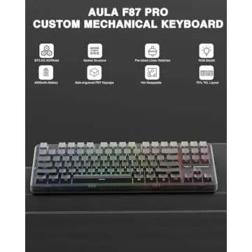 Show more Introducing the AULA F87 Pro Wireless Mechanical Keyboard – a game changer for anyone seeking quality, versatility, and unparalleled typing experience. This advanced keyboard supports three connection modes: Bluetooth, 2.4GHz wireless, and USB wired, allowing seamless connectivity to up to five devices simultaneously. Switch between devices effortlessly with just a press of a button or shortcut keys. Designed for all types of users, including gamers, professionals, and casual typists, the F87 Pro is built to meet every need, whether you're working or gaming.