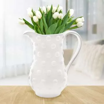 Show moreThis stunning Hobnail Style pitcher is a true showstopper, capturing the enchanting spirit of vintage aesthetics while seamlessly fitting into modern decor. Crafted with meticulous attention to detail, this 1.5 quart piece embodies the iconic dotted bump design that has been cherished since its popularization by Fenton milk glass. The retro look not only offers a timeless appeal but also enhances any space, making it an ideal addition to your home whether you adhere to contemporary or rustic farmhouse styles. Its elegant, fluid lines and charming texture make it a versatile piece, perfect for a myriad of uses.