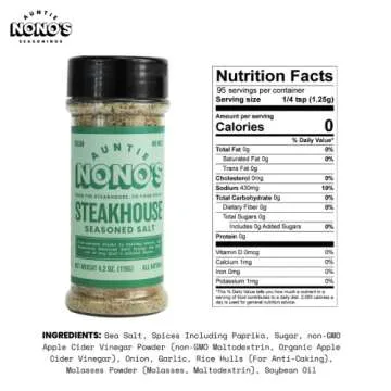 Show moreExperience a culinary breakthrough with Auntie Nono’s Steakhouse Seasoned Salt, your ultimate seasoning solution meticulously crafted from all-natural ingredients. This unique blend is designed to effortlessly enhance the natural flavors of your favorite dishes, including steaks, pork, burgers, and even straight-forward veggie preparations. Each sprinkle brings a burst of savory goodness without overwhelming your palate, making it an essential addition to any kitchen or grilling experience. This 4.2 oz. jar is not just a seasoning; it’s an invitation to elevate your cooking and impress your guests with mouthwatering flavor profiles.
