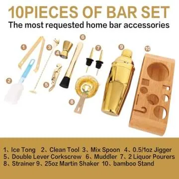 Show moreElevate your home bar experience with the AUOXIOUYM 10-Pcs Martini Cocktail Shaker Set, a glamourous cocktail crafting kit designed for both aspiring mixologists and professional bartenders alike. This stunning set encompasses everything you need to concoct a variety of cocktails, including a 25oz martini shaker, a strainer, a 10-inch bar mixing spoon, and a dual-sized jigger (0.5oz/1oz). Complete with essential tools like liquor pourers, a muddler, ice tongs, a double lever corkscrew, and a stylish bamboo stand, this collection is a quintessential companion for any bartending endeavor. The shimmering mirror gold plating not only reflects sophistication but also ensures every tool is durable, adding an elegant touch to your counter or bar. Whether you’re crafting an exquisite martini or shaking up a family-favorite cocktail, this set makes bartending effortless and enjoyable.