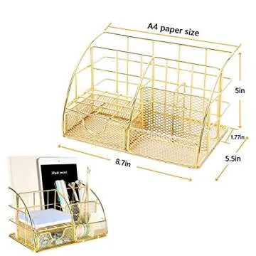 The desktop organizer is made of high-quality metal with a stylish gold finish and reinforced rims.