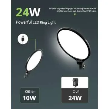 Show more Elevate your content creation with the Aureday 10.5” Dimmable Desktop Ring Light, a powerhouse in lighting designed specifically for today’s digital creators. This upgraded full-screen LED ring light delivers a brilliant 24W of power, offering bright, glare-free, and uniform illumination that ensures you look your best in every video conference, Zoom meeting, or live streaming session. Whether you’re vlogging, making tutorials, or connecting with your audience, having the right lighting is crucial, and this ring light is here to transform your setup.