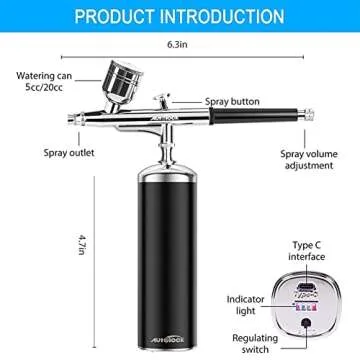 Show more Introducing the revolutionary dual-action airbrush by Autolock, where convenience meets high performance. This innovative design allows users to activate airflow simply by pressing the trigger, with liquid paint output controlled by pulling the trigger back, ensuring an effortless and precise painting experience. Unlike traditional models, this airbrush comes equipped with four indicator lights on the air compressor that clearly display battery power, allowing you to plan your art sessions accordingly.