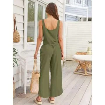 Show more Step into effortless style with the AUTOMET 2 Piece Summer Outfits for Women, a stunning and lightweight matching set perfect for those warm days ahead. Crafted from soft linen, this chic ensemble features a comfortable crop top and flowy wide-leg pants, ensuring you look fabulous while feeling at ease. Ideal for lounging, vacations, or casual outings, this set effortlessly combines fashion and functionality. Available in a rich Army Green shade, it not only complements your summer wardrobe but also brings an air of sophistication to any ensemble.