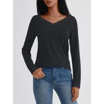 Show more Discover the perfect blend of comfort and style with the AUTOMET V Neck Loose Long Sleeve Shirt, a versatile addition to any wardrobe. This exquisite piece is crafted from a soft and breathable fabric made of rayon, polyester, and spandex, ensuring warmth during the colder months while still being light enough for year-round wear. Its elegant lace design on the cuffs and collar provides a chic and refined touch, making it ideal for various occasions, whether you're dressing up for a night out or keeping it casual. With a classic V-neckline and long sleeves, this shirt maintains a relaxed and casual silhouette that's great for layering or wearing alone.