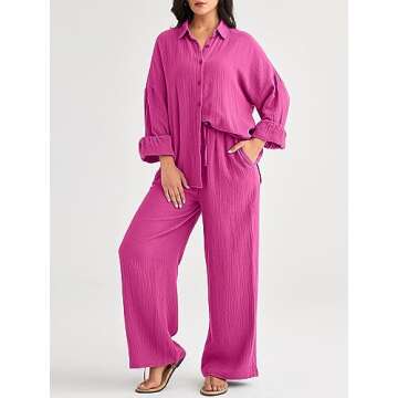 AUTOMET Preppy Clothes Womens Two Piece Outfits 2 Piece Matching Lounge Linen Wide Leg Palazzo Pants Sets Sweatsuit Fall Fashion 2023 Tracksuit, Hotpink