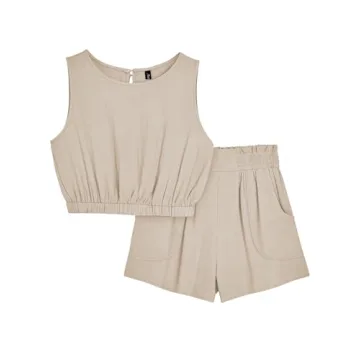 AUTOMET Women's Summer 2 Piece Outfits Shorts Sets Sleeveless Round Neck Crop Top Tank and High Waisted Shorts with Pockets Beige M