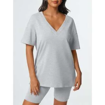 AUTOMET Womens 2 Piece Outfits Summer Sets Lounge Matching V Neck Tops 2024 Biker High Waist Shorts Spring Vacation Beach Cruise Trendy Sweatsuits