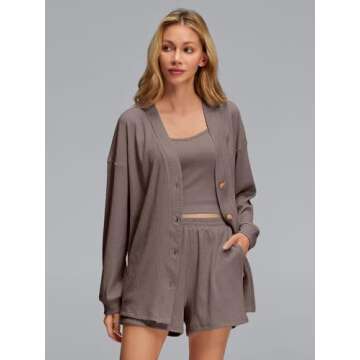 AUTOMET Womens 3 Piece Lounge Sets Sexy Cute Knit Plus Size Post Partum Pajamas Sets Shorts Cotton Soft Fall Matching pjs Casual Winter Loungewear Set with Cardigan Crop tops Mocha Brown