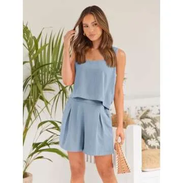 Show more Introducing the enchanting AUTOMET Women's Summer 2 Piece Outfits, meticulously crafted to elevate your fashion game this season. This exquisite light blue matching set features trendy shorts and a sleeveless top that seamlessly blend style with comfort. Made from high-quality linen, this outfit boasts a rich texture that ensures durability while offering a soft, breathable feel against the skin. As you slip into this stunning ensemble, you'll appreciate how it perfectly hugs your body, showcasing your silhouette gracefully for an effortlessly chic look.