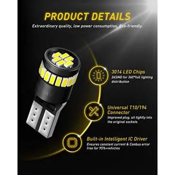- Error-Free Installation: These LED bulbs are crafted to be CANbus compatible, eliminating flickering issues and ensuring a seamless installation without any dashboard error messages.
