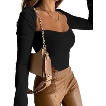 Avanova Women's Long Sleeve Ribbed Knit Crop Top Scoop Neck Asymmetrical Hem Tee Shirt Black Large