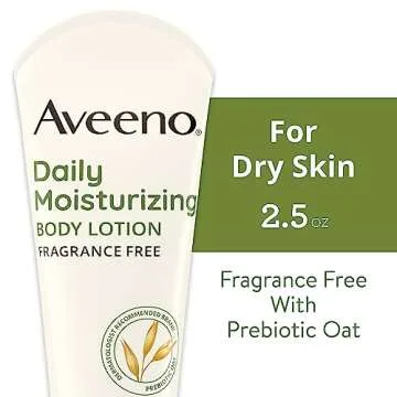 Show more Discover the hydrating magic of the Aveeno Daily Moisturizing Body Lotion, specifically formulated to offer intense nourishment for dry skin. Nestled conveniently in a 2.5-fluid ounce tube, this lotion is your go-to solution for achieving soft and healthy-looking skin. Harnessing the power of a clinically proven formula, it delivers an incredible 24-hour moisturization effect that deeply penetrates the skin. The unique blend of prebiotic oat is designed to absorb swiftly, reinforcing your skin’s natural moisture barrier, so you can enjoy beautifully radiant skin without any greasy residue.