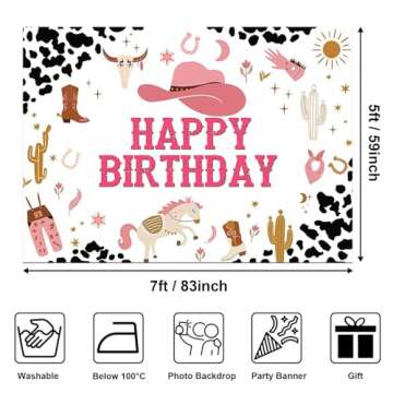 Show moreExperience the magic of the Wild West right at your birthday celebration with the Avezano Western Cowgirl Birthday Backdrop. This stunning 7x5ft (2.1x1.5m) backdrop perfectly embodies the essence of cowboy charm while providing a delightful setting for your photography needs. Crafted from durable, quality cotton, this backdrop not only showcases beautiful colors but also ensures longevity for memorable events. The lightweight design makes it easy to transport and store, allowing you to bring the excitement of a ranch lifestyle to any location. Whether it’s for a birthday party, a baby shower, or a cake table display, this backdrop is a true eye-catcher!