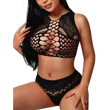 Show more Indulge in the exquisite allure of our Fishnet Lingerie Set, designed to tease and tantalize with its captivating mesh finish. This exclusive crop top set features a big round neckline, paired perfectly with matching mesh panties and dreamy stockings, allowing you to flaunt your curves effortlessly. Made from premium nylon and spandex, this lingerie set not only looks stunning but also provides a comfortable wearing experience that feels luxurious against your skin.